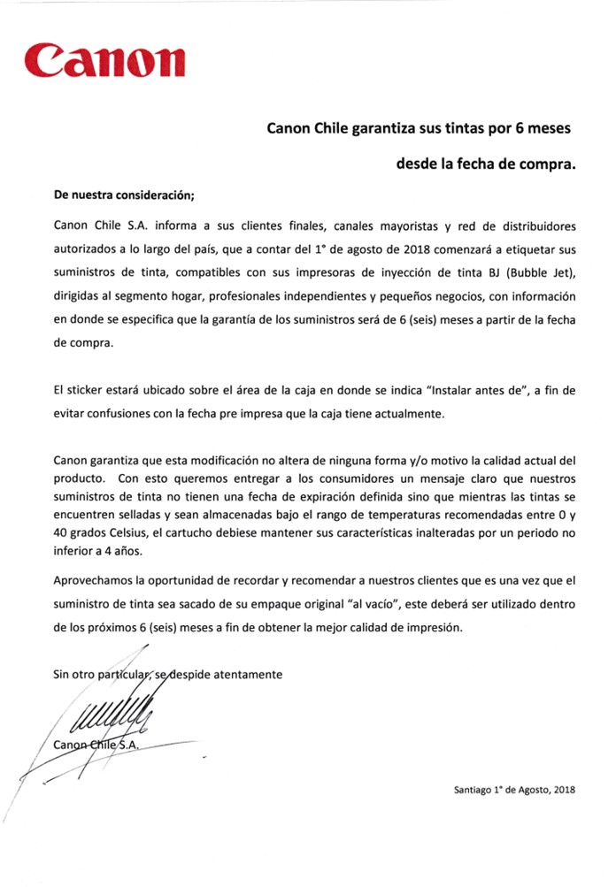 Canon Chile garantiza sus tintas por 6 meses desde la fecha de compra